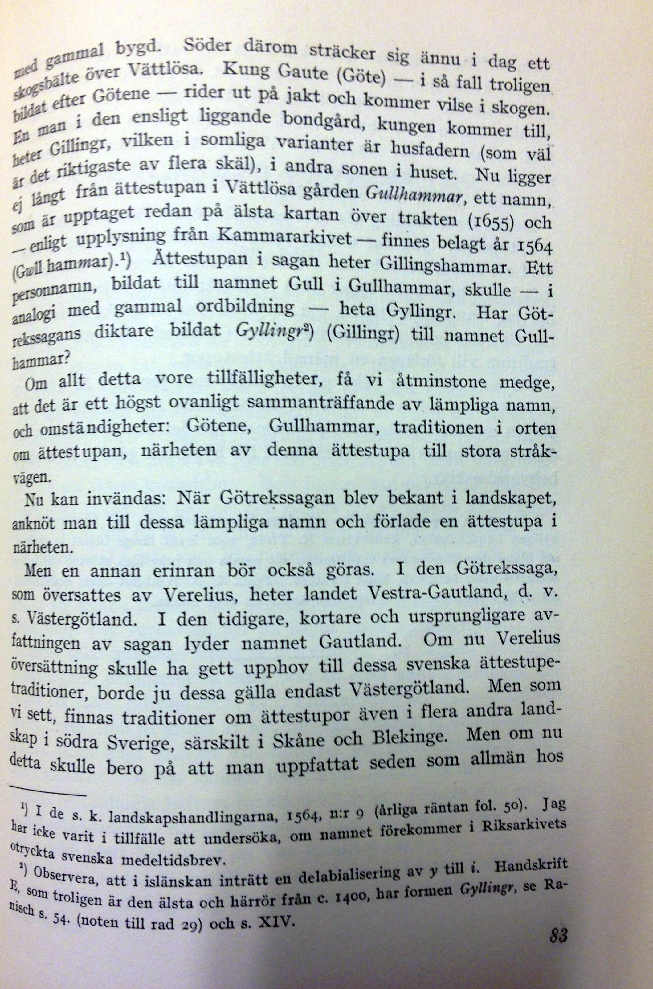 ”Söder därom sträcker sig ännu i dag ett skogsbälte över Vättlösa. Kung Gaute (Göte) – i så fall troligen bildat efter Götene – rider ut på jakt och kommer vilse i skogen. En man ensligt liggande bondgård, kungen kommer till, heter Gillingr, vilken i somliga varianter är husfadern (som väl är det riktigaste av flera skäl) i andra sonen i huset. Nu ligger ej långt fran ättestupan i Vättlösa gården Gullhammar, ett namn, som är upptaget redan på älsta kartan over trakten (1655) och – enligt upplysning från Kammararkivet – finnes belagt år 1564 (Gwll hammar).) Ättestupan i sagan heter Gillingshammar. Ett personnamn, bildat till namnet Gull i Gullhammar, skulle – i analogi med gammal ordbildning – heta Gyllingr. Har Götrekssagans diktare bildat Gyllingr) (Gillingr) till namnet Gullhammar?