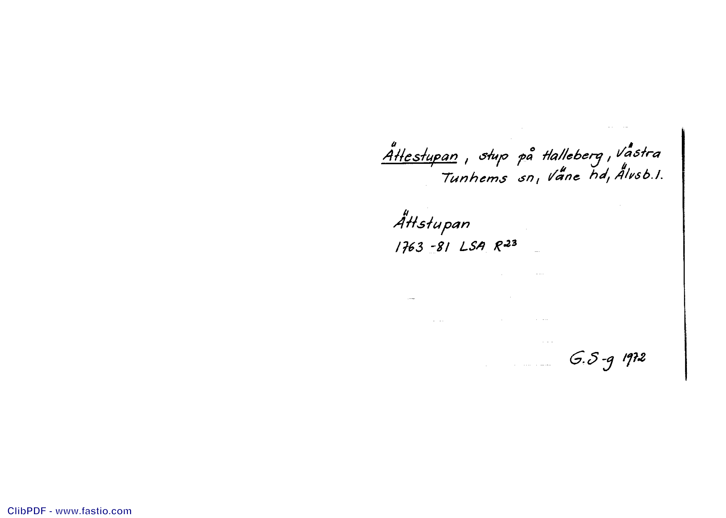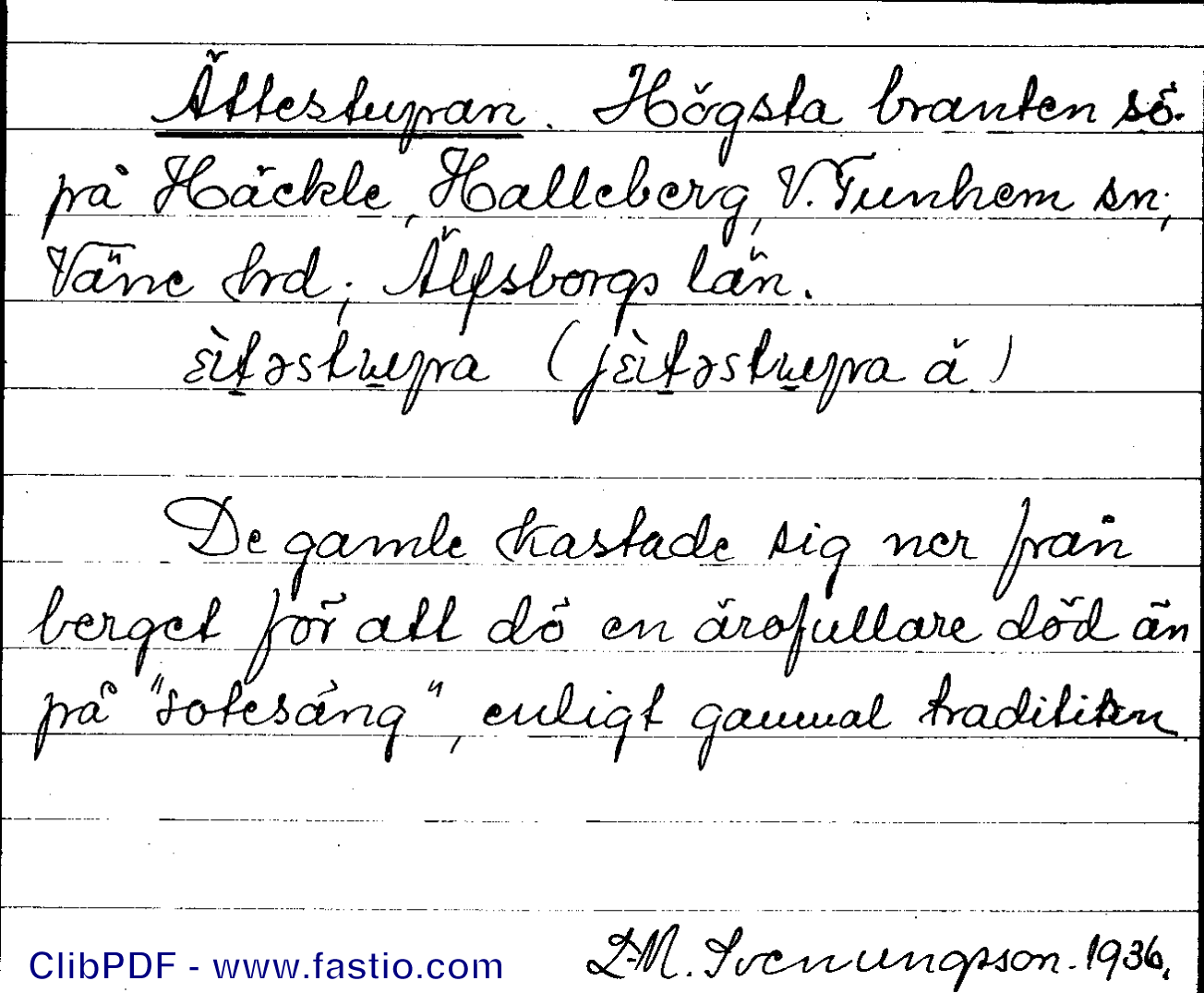 ”Quæ sicca et valde macra pars montis nomine appellatur »Häcklan». In parte ejus meridionali insunt illa magna, jam ab antiquis temporibus laudata, loca prærupta, quæ nomen »Hallebergs-ättestupa» acceperunt.”
