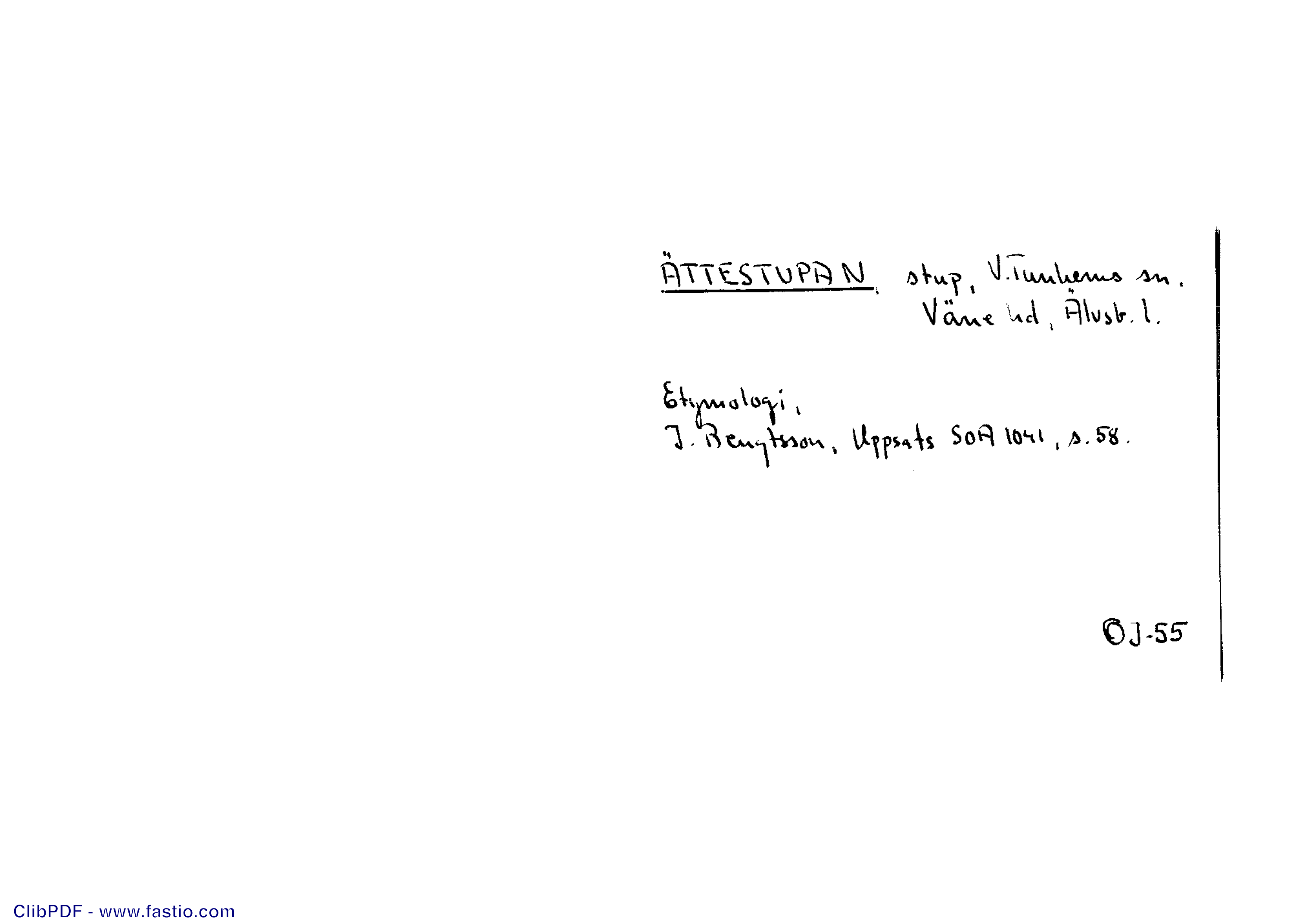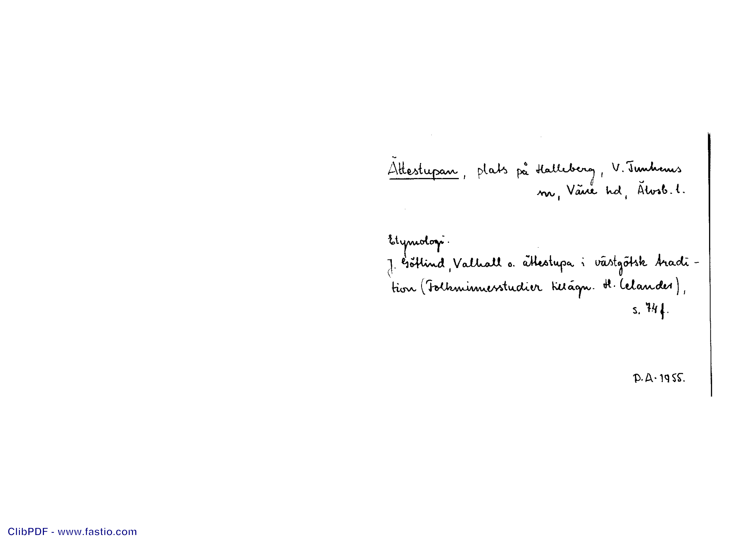 ”Ättestupan (nom. propr.) Vid Halleberg, »högsta branten på Häckleklint, utför vilken enligt sägnen forntidsmänniskorna störtade sig», SOÄ XII, 164. I anf. a. s. 167 heter det: »Omedelbart nedanför Ättestupan ligger Odens damm, i vilken enligt sägnen liken av de hedningar, som störtat sig utföre, tvättades. » På en karta av år 1826 står på detta ställe Ättestupen samt strax söder därom Odensdammen. Host Linné finnes den även omnämnd, Västg.-Resa s. 218: »Ättestörtan är en Wallhall på södersta sidan af Häckla. . . här säges de gamla Göter hafwa bråstört sig utföre». Det tidigaste belägget på ortnamnet Ättestupa som jag kunnat finna är ett kopparstick med årtalet 1705 i Dahlbergs Suecia (III: 50). Å detta står: Deliniatio præcipitii Ættestupa dietl, ln Monte Hæclaberg. På själva bilden är en lokalitet angiven med »Ättestupe»), Den finnes även omnämnd hos Tuneld och Ljungström (Wäne härad) m. fl. och nyligen i en uppteckning från Hallebergs-trakten VFF Liu. 240 (»Hallebergs ättestupa»).”