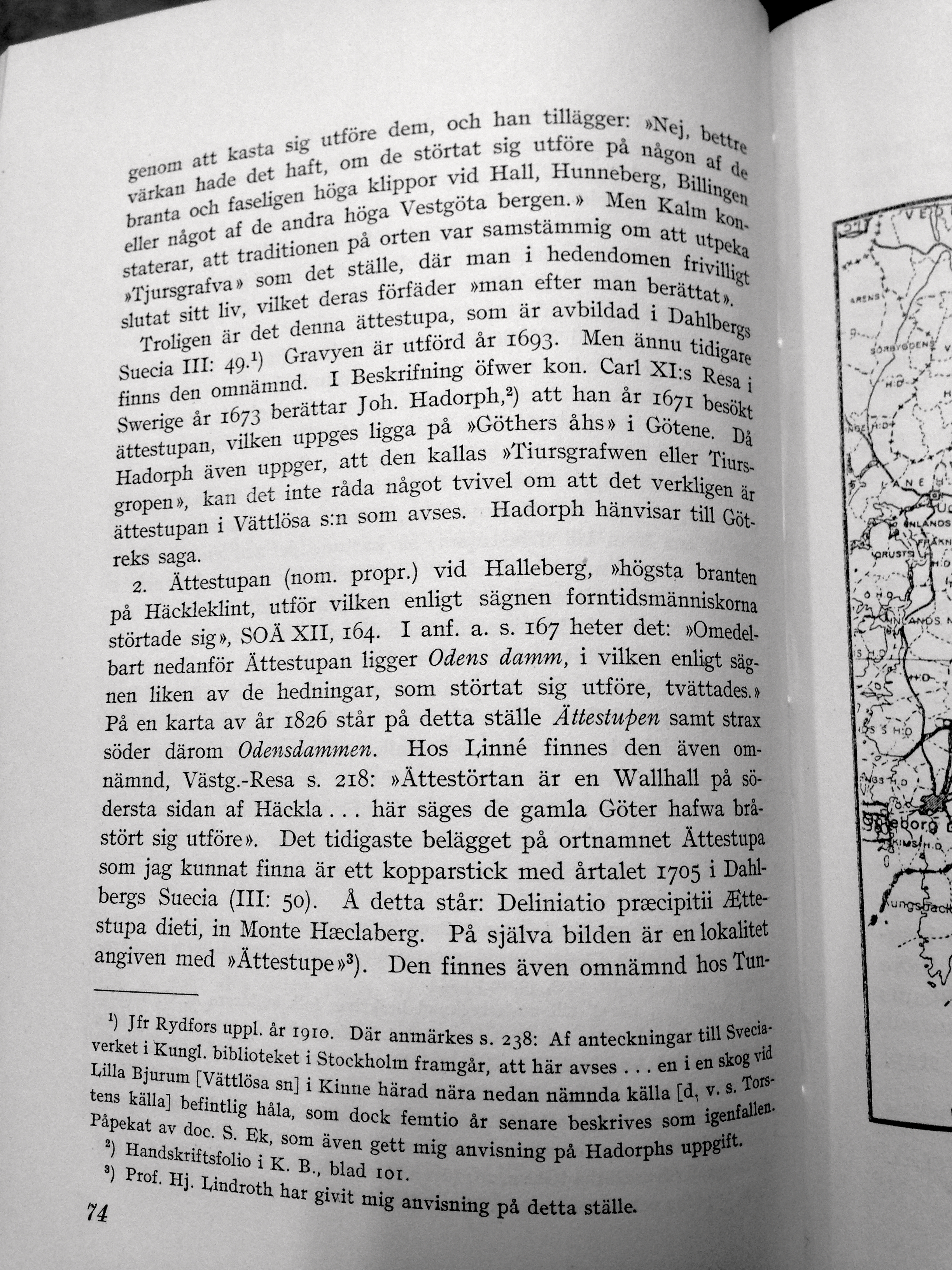 ”Öfver våra hufvuden reser sig Halleberg tvärbrant, och folket utpekar detta ställe såsom en s. k. ättestupa, där de, som fruktade sotdöden, funno en utväg att hastigt bli förflyttade till Odins salar. En straxt invid belägen, nästan uttorkad göl kallas ännu i dag Odins dam, emedan liken där tvättades före grafläggningen.”
