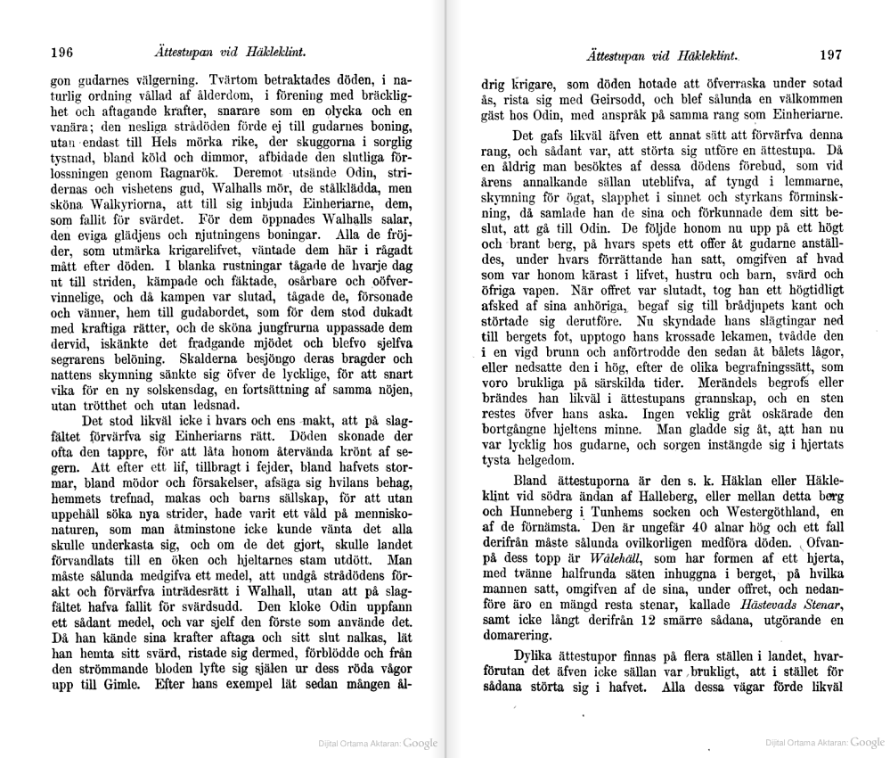 Bland ättestuporna år den s. k. Häklan eller Häkleklint vid södra ändan af Halleberg, eller mellan detta berg och Hunneberg i Tunhems socken och Westergöthland, en af de förnämsta. Den är ungefär 40 alnar hög och ett fall derifrån måste sålunda ovilkorligen medföra döden. Ofvanpå dess topp är Wålehäll, som har formen af ett hjerta, med tvänne halfrunda säten inhuggna i berget, på hvilka mannen satt, omgifven af de sina, under offret, och nedanföre äro en mängd resta stenar, kallade Hästevads Stenar, samt icke långt derifrån 12 smärre sådana, utgörande en domarering.