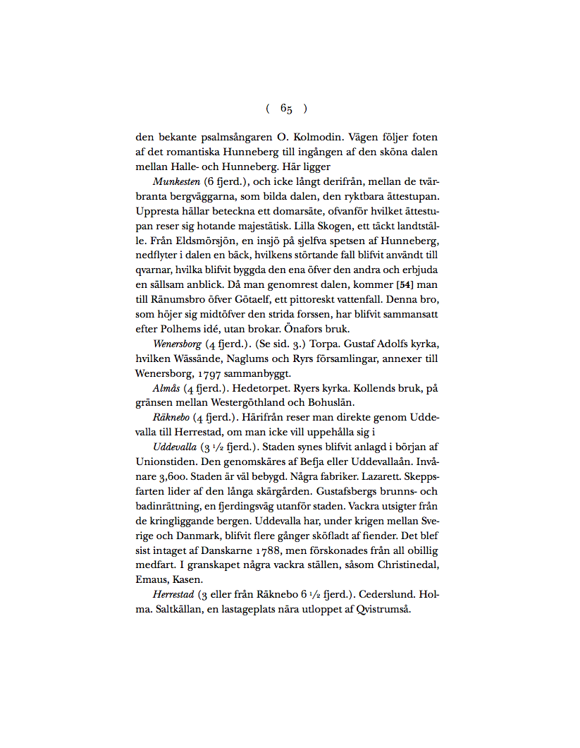 Nach der Ättestupa hört der Halleberg auf und der Hunneberg verändert seine, bis jetzt mit ihm parallele, Richtung nach Westen mehr nach Süden, und begleitet den Wanderer links noch eine halbe Meile. Hier waren einige Wassermühlen, und fast bei jedem einzelnen Gehöft sieht man kleine Mühlen, die viel Holz kosten, und doch immer schlechtes Mehl geben.”