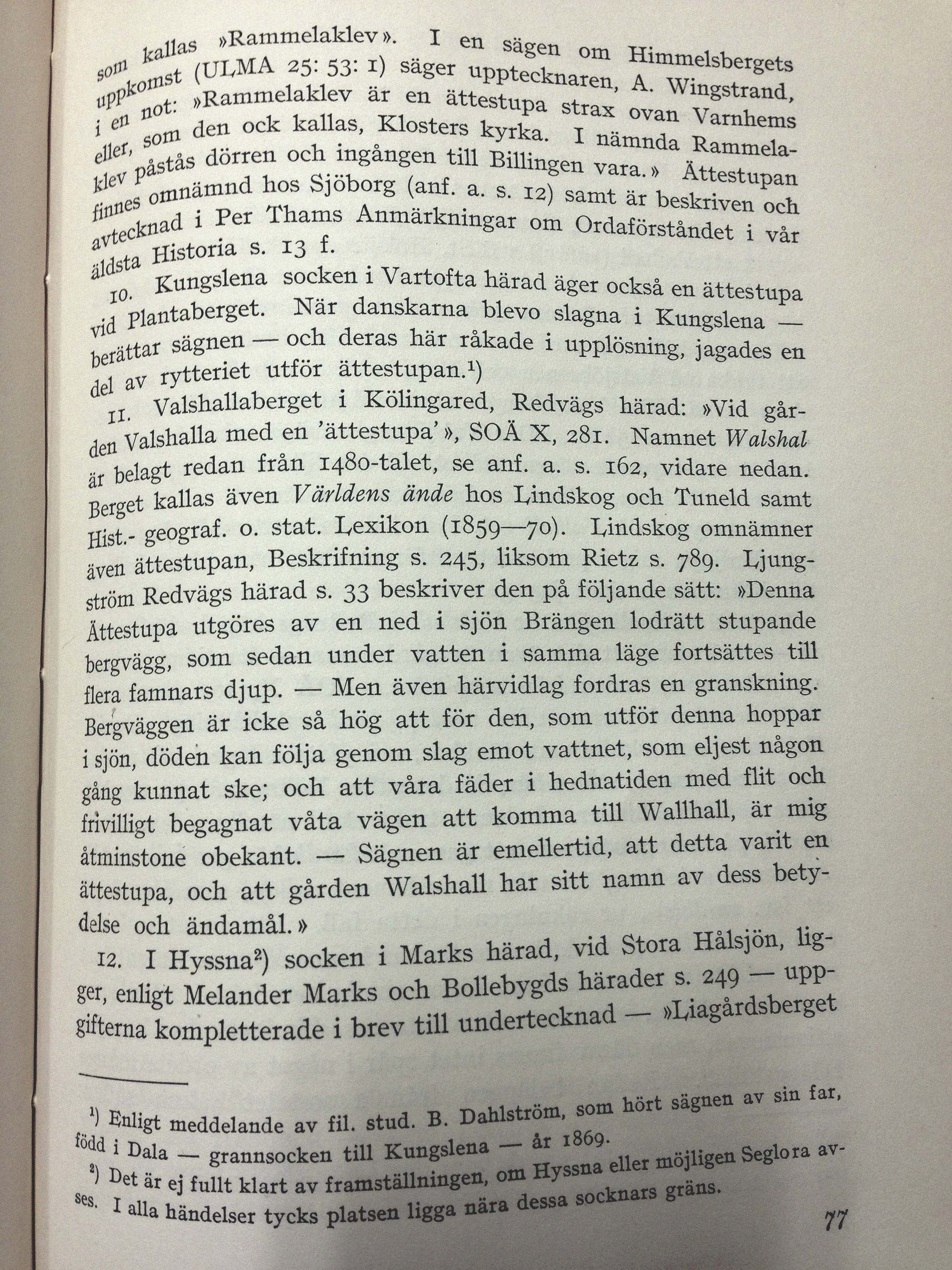 (”Valhall och ättestupa i västgötsk tradition” av Johan Götlind, s. 77 / Folkloristiska Studier och Samlingar 2 / Folkminnes-Studier tillägnade hilding celander den 17 juli 1926)