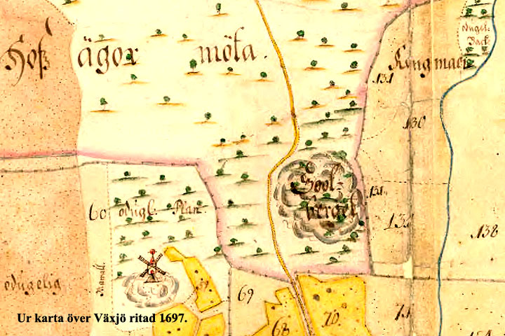 Utsnitt från karta över Växjö ritad 1697. Den visar hur förhållandena var 1741 då Linné besökte Solberget. På kartan är gränsen för Hovs by, senare i landsförsamligen, förtydligad med röd färg.