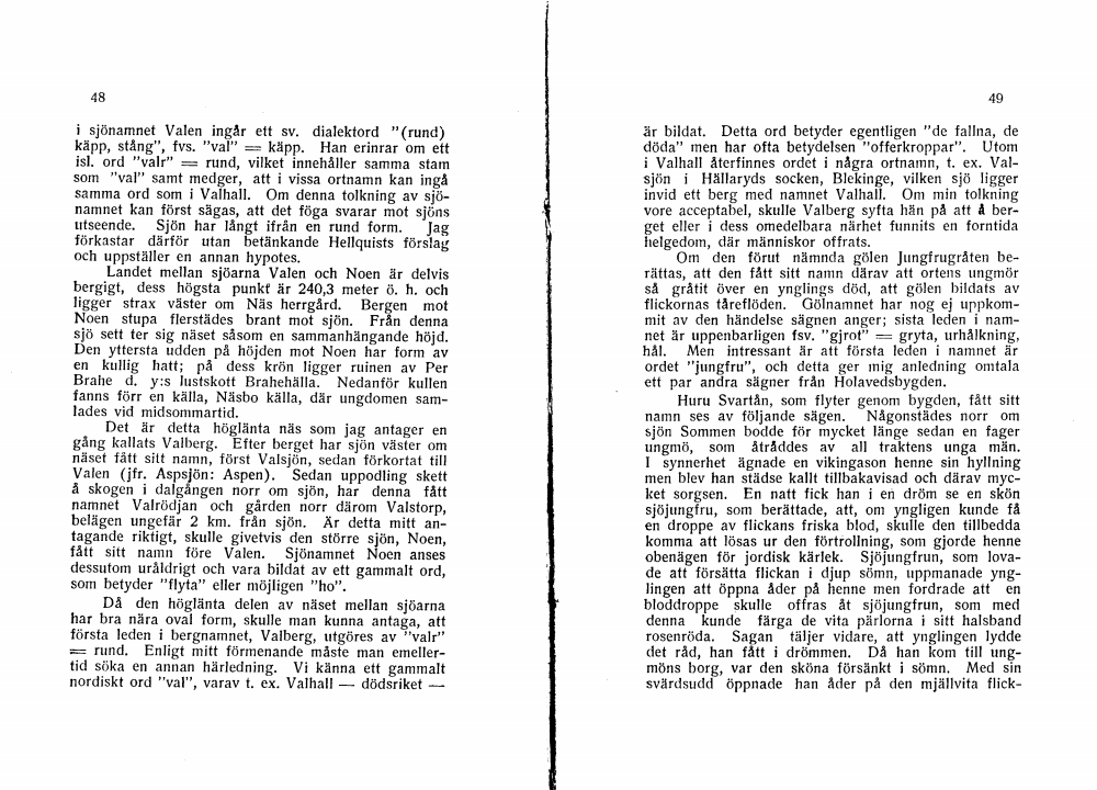 ”Då den höglänta delen av näset mellan sjöarna har bra nära oval form, skulle man kunna antaga, att första leden i bergnamnet,Valberg, utgöres av ”valr” rund. Enligt mitt förmenande måste man emeller- tid söka en annan härledning. Vi känna ett gammalt nordiskt ord ”val”, varav t. ex. Valhall – dödsriket – är bildat. Detta ord betyder egentligen ”de fallna, de döda” men har ofta betydelsen ”offerkroppar” . Utom i Valhall återfinnes ordet i några ortnamn, t. ex. Val- sjön i Hällaryds socken, Blekinge , vilken sjö ligger invid ett berg med namnet Valhall. Om min tolkning vore acceptabel, skulle Valberg syfta hän på att å ber- get eller i dess omedelbara närhet funnits en forntida helgedom, där människor offrats.”