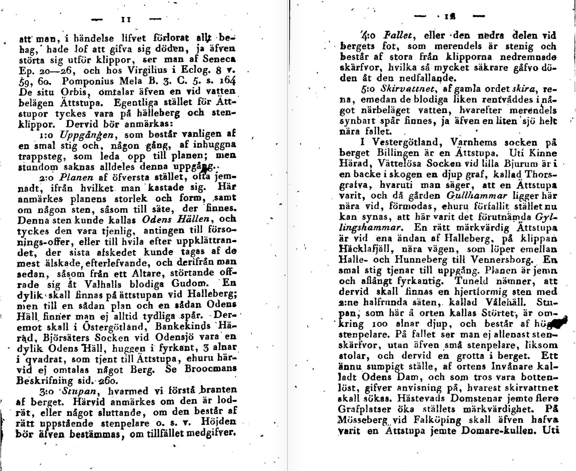 2:o Planen af öfversta stället, ofta jemnadt, ifrån hvilket man kastade sig. Här anmärkes planens storlek och form, samt om någon sten, såsom till säte, der finnes. Denna sten kunde kallas Odens Hällen, och tyckes den vara tjenlig, antingen till försonings-offer, eller till hvila efter uppklättrandet, der sista afskedet kunde tagas af de mest älskade efterlefvande, och derifrån man sedan, såsom från ett Altare, störtande offrade sig åt Valhalls blodiga Gudom. En dylik skall finnas på ättstupan vid Halleberg; men till en sådan plan och en sådan Odens Häll finner man ej alltid tydliga spår. Deremot skall i Östergötländ, Bankekinds Härad, Björsäters Socken vid Odensjö vara en dylik Odens Häll, huggen i fyrkant, 3 alnar i qvadrat, som tjent till Ättstupa, ehuru härvid ej omtalas något Berg. Se Broocmans Beskrifning sid. 260.