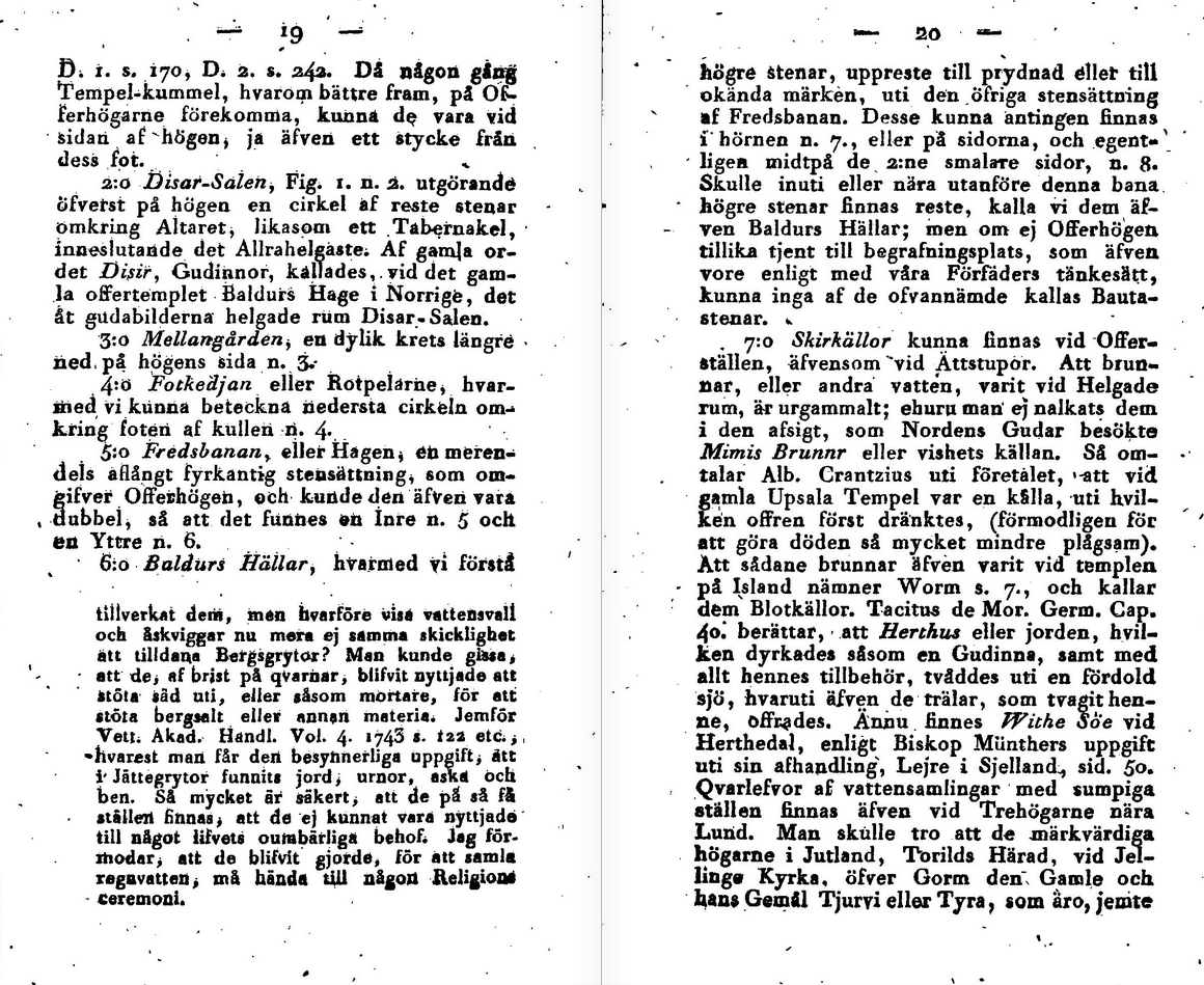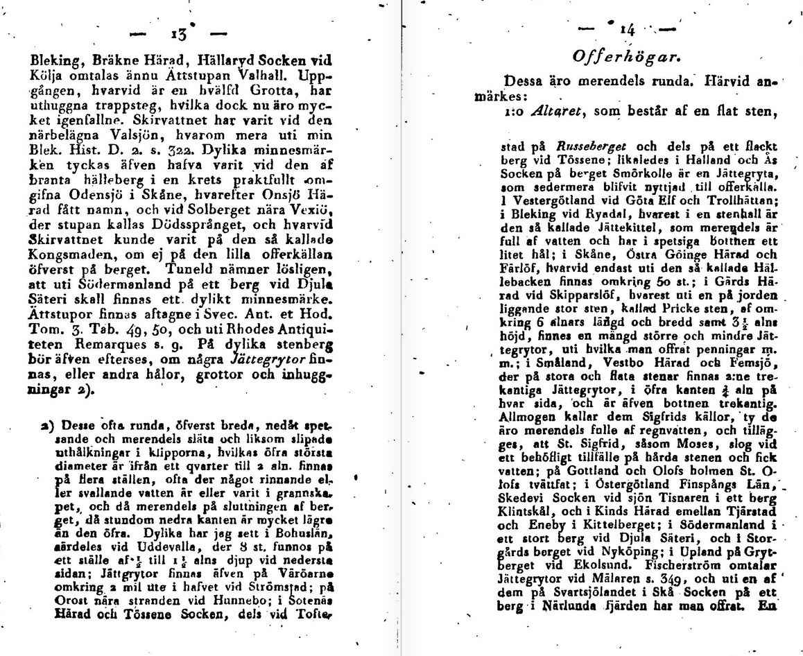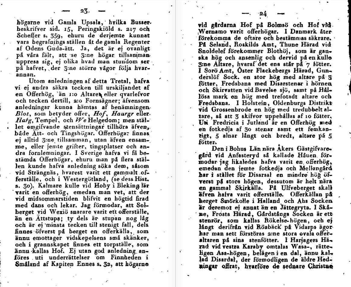 Utom anledningen af detta Tretal, hafva vi ej andra säkra tecken till urskiljandet af en Offerhög, an 1:0 Altaren eller qvarlefvor och tecken dertill, 2:0 Fornsägner; äfvensom anledningar kunna hämtas af benämningen Blot, sorn betyder offer, Hof, Haurgr eller Harg, Tempel, och WeHelgedom; men stället omgifvande stensättningar tillhöra äfven, både Att- och Tingshögar. Offerhögar finnas ej alltid 3:ne tillsamman, utan äfven ensamme, eller jemte grifter, tingsplatser och andra fornlemningar. I Sverige hafva vi få bestämda Offerhögar, ehuru man på flera ställen kunde hafva anledning söka dem, såsom vid Strängnäs, hvarest varit ett gammalt offerställe, och i Westergötland, (se dess Hist. s. 30). Kalmare kulle vid Hoby i Bleking lär varit en offerhög, emedan man vet, att der vid midsommarstiden blifvit en högtid firad med dans och lekar. Jag förmodar, att Solberget vid Wexiö snarare varit ett offerställe, än en Ättstupa; ty dels är stupan nog låg och är ej minsta tecken till stenigt fall, dels finnes öfverst på berget en offerkälla, som ännu emottager vidskepelsens små skänker, och i grannskapet finnes ett torpställe, som ännu kallas Hof. Ej utan god anledning anföres uti underrättelser om Finnheden i Småland af Kapiten Ennes s. 32, att högarna vid gårdarna Hof på Bolmsö och Hof vid Wernamo varit offerhögar. I Danmark åter förekomma de oftare och bestämmas säkrare. På Seland, Roskilds Amt, Thune Härad vid Snoldelef förekommer Blothöj, som är ganska hög och ansenlig och dervid på en kulle 3:ne Altare, hvaraf det ena står på 7 fötter. I Sorö Amt, Öster Flackebergs Härad, Gunderslöf Sock. en stor hög med altare på 3 fötter, Fredsbana med Disarstenar i hörnen och Skirvatten vid Bavelse sjö, samt på Hållösa mark en hög med trefotadt altare och Fredsbana. I Holstein, Oldenburgs Distrikt vid Grossenbrode en hög med tredubbelt altare, så att 3 skifvor uppehållas af 10 fötter. Uti Fredricia i Jutland är en Offerhög med end fotkedja af 30 stenar samt ett femkantigt, 5 alnar långt och bredt, altare på 5 fötter.