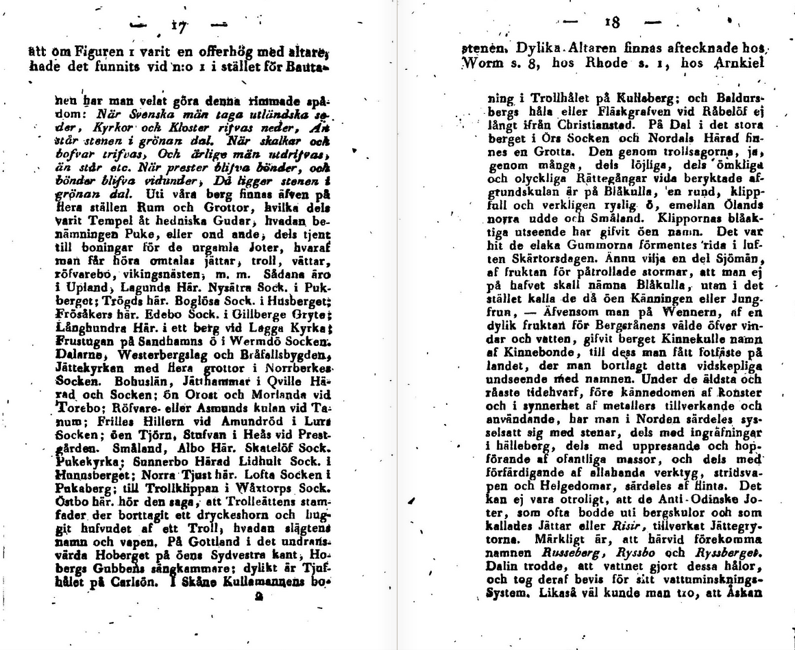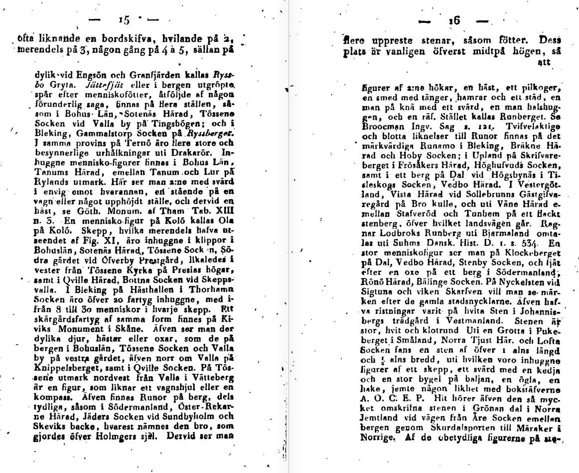 ² Desse ofta runda, öfverst breda, nedåt spetsande och merendels släta och liksom slipade uthålkningar i klipporna , hvilkas öfra största diameter är ifrån ett qvarter till 2 aln. finnas på flera ställen, ofta der något rinnande eller svallande vatten är eller varit i grannskapet, och då merendels på sluttningen af berget, då stundom nedra kanten är mycket lägre än den öfra. Dylika har jag sett i Bohuslän, särdeles vid Uddevalla, der 8 st. funnos på ett ställe af 1/2 tll 1 1/2 alns djup vid nedersta sidan; Jättgrytor finnas äfven på Väröarne omkring 2 mil Ute i hafvet vid Strömstad; på Orost nära stranden vid Hunnebo; 1 Sotenäs Härad och Tössene Socken, dels vid Toftestad på Russeberget och dels på ett flackt berg vid Tössene; likaledes i Halland och Ås Socken pä berget Smörkolle är en Jättegryta, som sedermera blifvit nyttjad till offerkälla. I Vestergötland vid Göta Elf och Trollhättan; i Bleking vid Ryadal, hvarest i en stenhäll är den så kallade Jättekittel, som merendels är full af vatten och har i spetsiga bottnen ett litet hål; i Skåne, Östra Goinge Härad och Färlöf, hvarvid endast uti den så kallade Hällebacken finnas omkring 5o st.; i Gärds Härad vid Skipparslöf , hvarest uti en på jorden liggande stor sten, kallad Pricke sten , af omkring 6 alnars längd och bredd samt 3 1/2 alns höjd, finnes en mängd större och mindre Jättegrytor, uti hvilka man offrat penningar m. m. ; i Småland, Vestbo Härad och Femsjö, der på stora och flata stenar finnas 2:ne trekantiga Jättegrytor, i öfra kanten 3/4 aln på hvar sida, och är äfven bottnen trekantig. Allmogen kallar dem Sigfrids källor, ty de äro merendels fulle af regnvatten, och tillägges att St. Sigfrid, såsom Moses, slog vid ett behöfligt tillfälle på hårda stenen och fick vatten; på Gottland och Olofs holmen St. Olofs tvättfat; i Östergötland Finspångs Län, Skedevi Socken vid sjön Tisnaren i ett berg Klintskål, och i Kinds Härad emellan Tjärstad och Eneby i Kittelberget; i Södermanland i ett stort berg vid Djula Säteri, och i Storgårds borget vid Nyköping; i Upland på Grytberget vid Ekolsund. Fischerström omtalar Jättegrytor vid Mälaren s. 349, och uti en af dem på Svartsjölandet i Skå Socken på ett berg i Närlanda fjärden har man offrat. En dylik vid Engsön och Granfjarden kallas Ryssbo Gryra. Jättefjät eller i bergen utgröpte, spår efter menniskofötter, åtföljde af någon förunderlig saga, finnas på Hera ställen, såsom i Bohus Län, Sotenäs Härad, Tössene Socken vid Valla by på’ Tingshögen; och i Bleking, Gammalstorp Socken på Ryssberget. I samma provins på Ternö äro flere store och besynnerlige urhålkningar uti Drakarör. Inhuggne mennisko-figurer finnas i Bohus Län, Tanums Härad, emellan Tanum och Lur på Rylands utmark. Här ser man 2:ne med svärd i envig emot hvarannan, en stående på en vagn eller något upphöjdt ställe, och dervid en häst, se Göth. Monum. af Tham Tab. XIII n. 5. En mennisko figur på Kolö kallas Ola på Kolör Skepp hvilka merendels hafva utseendet af Fig. XI, äro inhuggne i klippor i Bohuslän, Sotenäs Härad, Tössene Socken, Södra gärdet vid Öfverby Prestgård, likaledes i vester från Tössene Kyrka på Presias högar, samt i Qville Härad, Bottna Socken vid Skeppsvalla. I Bleking på Hästhallen i Thorhamn Socken äro öfver 20 fartyg inhuggne, med ifrån 8 till 30 menniskor i hvarje skepp. Ett skärgårdsfartyg af samma form finnes på Kiviks Monument i Skåne. Äfven ser man der dylika djur, hästar eller oxar, som de på bergen i Bohuslän, Tössene Socken och Valla by på vestra gärdet, äfven norr om Valla på Knippelsberget, samt i Qville Socken. På Tössene utmark nordvest från Valla i Vätteberg är en figur, som liknar ett vagnshjul eller en kompass. Äfven finnas Runor på berg, dels tydliga, såsom i Södermanland, Öster-Rekarne Härad, Jäders Socken vid Sundbyholm och Skeviks backe, hvarest nämnes den bro, som gjordes öfver Holmgers sjal. Dervid ser man figurer af 2:ne hökar, en häst, ett pilkoger, en smed med tänger, hamrar och ett städ, en man på knä med ett svärd, en man halshuggen, och en räf. Stället kallas Runberget. Se Broocman Ingv. Sag s. 121, Tvifvelaktige och blotta liknelser till Runor Ennas på det märkvärdiga Runamo i Bleking, Bräkne Härad och Hoby Socken; i Upland på Skrifvareberget i Frösåkers Härad, Höghufvuds Socken, samt i ett berg på Dal vid Högsbynas i Tisleskogs Socken, Vedbo Härad. I Vestergötland, Vista Härad vid Sollebrunns Gästgifvaregård på Bro kulle, och uti Väne Härad emellan Stafveröd och Tunhem på ett Hacktstenberg, öfver hvilket landsvägen går. Ragnar Lodbroks Runberg uti Bjarmaland omtalas uti Suhms Dansk. Hist. D. 1. s. 534. En stor menniskofigur ser man på Klockeberget på Dal, Vedbo Härad, Stenby Socken, och fjät efter en oxe på ett berg i Södermanland, Rönö Härad, Bälinge Socken. På Nyckelsten vid Sigtuna och viken Skarfven vill man se märken efter de gamla stadsnycklarne. Äfven hafva ristningar varit på hvita Sten i Johannisbergs trädgård i Vestmanland. Stenen är stor, hvit och klotrund Uti en Grotta i Pukeberget i Småland, Norra Tjust Här. och Lofta Socken fans en sten af öfver 1 alns längd och 1/2 alns bredd, uti hvilken voro inhuggne figurer af ett skepp, ett svärd med en kedja och en stor bygel på baljan, en ögla, en hake, jemte någon likhet med bokstäfverna A. O. C. E. P. Hit hörer äfven den så mycket omskrivna stenen i Grönan dal i Norra Jemtland vid vägen från Åre Socken emellan bergen genom Skurdalsporten till Märaker i Norrige. Af de obetydliga figurerne på stenen har man velat göra denna rimmade spådom: När Svenska män taga utländska seder , Kyrkor och Kloster rijvas neder, Än står stenen i grönan dal. När skalkar och bofvar trifvas, Och ärlige män utdrifvas, än står etc. När prester blifva bönder, och bönder blifv