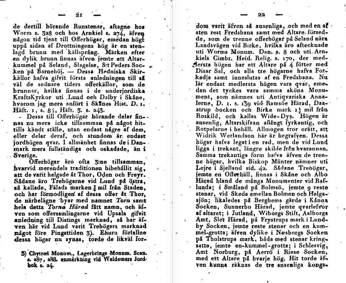 Offerhögar äro ofta 3:ne tillsamman, hvarvid merendels traditionen bibehållit sig, att de varit helgade åt Thor, Oden och Freyr. Sådane äro Trehögarne vid Lund på östra, så kallade, Fälads marken 1/4 mil från Staden, och har förmodligeri af dessa offer åt Thor, de närbelägne byar med namnet Torn samt hela detta Torna Härad fått namn, och äfven som offersamlingarne vid Upsala gifvit anledning till Distings marknad, så har äfven här vid Lund varit Trehögars marknad något före Pingsttiden ³. Ehuru förfallne dessa högar nu synas, torde de likväl fordom varit äfven så ansenliga, och med en af sten rest Fredsbana samt med Altare, försedde, som de trenne offerhögar på Seland nära Landsvägen vid Birke, hvilka äro aftecknade uti Worms Monum. Dan. s. 8 och uti Arnkiels Gimbr. Heid. Relig. s. 170, der medlersta bögen har ett Altare på 4 fötter med Disar Sal, och alla tre högarne hafva Fotkedja samt inneslutas af en Fredsbana. Nu lär endast medlersta högen vara qvar, emedan det tyckes vara samna sköna Monument, som nämnes uti Antiqvariska Annalerne, D. 1. s. 139 vid Ramsöe Härad, Daastrup Socken och Birke mark 1,5 mil från Roskild, och kallas Wide-Dys. Högen är ansenlig, Altarskifvan aflångt fyrkantig, och Rotpelarne i behåll. Allmogen tror orätt, att Widrik Werlandson här är begrafven. Dessa högar hafva legat i en rad, men de vid Lund ligga i trekant, längre skilde från hvarannan, Samma trekantiga form hafva äfven de trenne högar, hvilka Biskop Münter nämner uti Lejre i Sjelland sid. 42. Sådane Trehögar, jemte en Offerhäll, finnas i Skåne och Albo Härad bland de många Monumenter vid Raflunda; i Småland på Bolmsö, jemte 9 reste stenar, vid Skeda emellan Bolmen och Helgasjön; likaledes på Berghems gärde i Kånna Socken, Sunnerbo Härad, jemte qvarlefvor af altaret; i Jutland, Wiborgs Stift, Aalborgs Amt, Slet Härad, på Frystrups mark i Lundby Socken, jemte reste stenar och en kummel-grotta; äfven dylike i Næsborgs Socken på Tholstrups mark, båda med stenar kringsatte, jemte en-kummel-grotta; i Schlesvig, Amt Norburg, på Aerrö i Riese Socken, med ett Altare på hvarje hög. Hit torde äfven kunna räknas de tre ansenliga kongshögarne vid Gamla Upsala, hvilka Busser beskrifver sid. 15, Peringskiöld s. 217 och Scheffer s. 359, ehuru de derjemte kunnat vara begrafnings ställen åt de gamla Regenter af Odens Guda-ätt. Ja, det är ej ovanligt på våra fält, att se 3:ne högar tillsamman uppresa sig, ej olika hvad man stundom ser på hafvet, der 3:ne större vågor följa hvarannan.