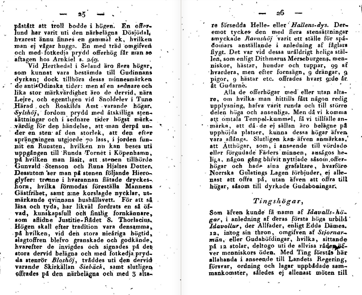 Vid Herthedal i Seland äro flera högar, som kunnat vara bestämda till Gudinnans dyrkan; dock tillhöra dessa minnesmärken de anti Odinska tider: men af en sednare och lika stor märkvärdighet äro do dervid, nära Lejre, och egentligen vid Snoldelev i Tune Härad och Roskilds Amt varande högar. Sylshöj, fordom prydd med åtskilliga stensättningar och i sednare tider högst märkvärdig för den händelse, att man derpå under en sten af den storlek, att den efter sprängningen utgjorde 70 lass, i jorden funnit en Runsten, hvilken nu kan beses uti uppgången till Runda Tornet i Köpenhamn, på hvilken man läsit, att stenen tillhörde Gunvald Stenson och Runa Hjaltes Dotter. Dessutom ser man på stenen följande Hieroglyfer: trenne i hvarannan flätade dryckeshorn, h vilka förmodas föreställa Mannens Gästfrihet, samt 2:ne korslagde nycklar, utmärkande qvinnans hushållsvett. För alt så läsa och tyda, har likväl fordrats en så öfvad, kunskapsfull och fintlig fornkännare, som aflidne Justitie-Rådet S. Thorlacius. Högen skall efter tradition vara densamma, på hvilken, vid den stora nieåriga högtid, slagtoffren blefvo granskade och godkände, hvarefter de invigdes och signades på det stora dervid belägna och med fotkedja prydda stenrör Blothöj, tvåddes uti den dervid varande Skirkällan Siebäck, samt slutligen offrades på den närbelägna och med 3 altare försedda Helle- eller Hallens-dys. Deremot tyckes den med flera stensättningar smyckade Ravnshöj varit ett ställe för spådomars anställande i anledning af fåglars flygt. Det var vid dessa uråldrigt heliga ställen, som enligt Dithmarus Merseburgens. menniskor, hästar, hundar och tuppar, 99 af hvardera, men efter fornsägn, 9 drängar, 9 pigor, 9 hästar etc. offrades hvart 9:de år åt Gudarne.