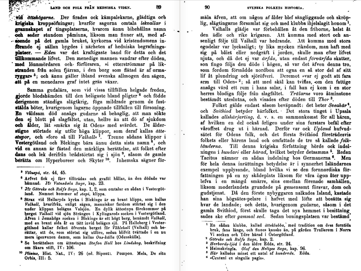 ”Samma gudalära, som vid vissa tillfällen helgade freden, gjorde blodshämden till den heligaste bland pligter och födde derigenom ständiga slägtkrig, föga mildrade genom de faststälda böter, hvarigenom lagarne öppnade tillfällen till försoning. En våldsam död ansågs gudarne så behaglig, att man sökte den ej blott på slagfältet, utan, hellre än att dö af sjukdom och ålder, lät »märka sig åt Oden» med svärdet. De ålderstigne störtade sig utför höga klippor, som deraf kallas ättestupor, och »foro så till Valhall». Trenne sådana klippor i Vestergötland och Blekinge bära ännu detta sista namn, och vid en annan är fästad den märkliga berättelse, att folket efter dans och lek derifrån brådstörtat sig i sjön, såsom de gamle berätta om Hyperboreer och Skyter. Inhemska sägner förmala äfven, att om någon af ålder blef sängliggande och skröplig, slägtingarne församlat sig och med klubba ihjelslagit honom.¹